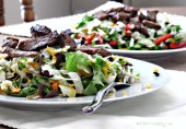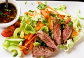 Легкий и нежный салат из свежих овощей, пикантность которому придают ломтики обжаренной говядины. Для придания салату изысканного вкуса лучше всего подойдет заправка из соевого соуса.