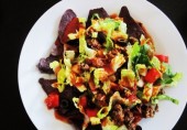 Салат из зелени с тертой морковью, сыром и говяжьим фаршем, обжаренным на растительном масле, заправленный уксусом с маслом и горчицей и политый острым соусом.