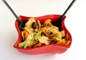 Салат из обжаренного говяжьего фарша с приправой тако, мексиканским сыром, сальсой, йогуртом, латуком, оливками и помидорами.