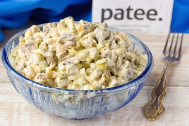 Вкусный и сытный салат, несмотря на отсутствие картофеля. Консервированная кукуруза - один из его ингредиентов, поэтому оформить его можно в виде початка кукурузы.