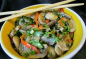 Салат из грибов, мангольда, сладкого перца, помидоров и лука, приготовленных на гриле, заправленный оливковым маслом с чесноком и специями.