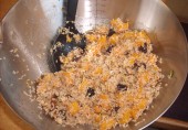 Салат из пшеницы и тыквы с добавлением обжаренных грецких орехов, тыквенных семян, инжира и лимонного сока.