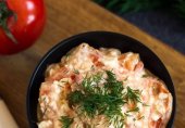 Этот вкусный салат с крабовыми палочками, твёрдым сыром, помидорами и чесноком можно встретить под многими названиями, такими как “Дипломат”, “Красное море” и другие.