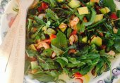 Свежий салат из маркови, листьев салата, петрушки, сушоных помидоров, свежых огурцов и помидоров, болгарский перец.