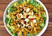 Вегетарианский салат из запеченной фасоли с карри, латуком, яблоками и изюмом.