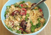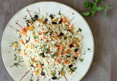 Салат из кускуса с морковью, луком, изюмом, мятой и курагой, заправленный лимонным и апельсиновым соком с йогуртом, медом, рисовым уксусом и оливковым маслом.