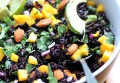 Легкий салат из черного риса с манго , луком и зеленью, заправленный соусом из сока лайма с оливковым маслом, медом и чесноком.