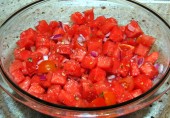 Вкусный освежающий салат с арбузом, помидорами черри, луком, сушеной петрушкой и соком лайма.