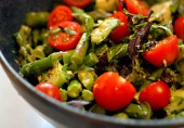 Салат из спаржи с базиликом, виноградными помидорами и авокадо не только полезный, но и очень вкусный.