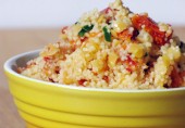 Салат из кускуса с чечевицей, вялеными помидорами, морковью, миндалем и лимоном, заправленный лимонным соком с оливковым маслом.