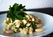 Салат из отварной белой фасоли с луком, зеленью и специями, заправленный соком лимона и оливковым маслом.