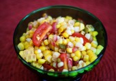 Салат из кукурузы с помидорами и свежим базиликом, заправленный соком лайма. Можно добавить немного перца халапеньо и красного лука - получится сальса.
