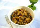 Салат из свежей рукколы с консервированной фасолью и тертым пармезаном, заправленный лимонным соком и оливковым маслом.
