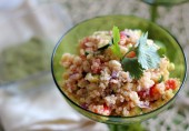 Салат из булгура с помидорами, огурцами, зеленым луком, чесноком и петрушкой, заправленный соусом из оливкового масла с лимонным соком и горчицей.