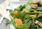 Салат из жареного филе лосося с шпинатом, рукколой, миндалем и апельсином, заправленный лимонным соусом.