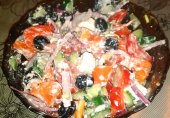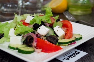 Салат Греческий - традиционный салат греческой кухни, лёгкий, низкокалорийный, так как состоит из овощей в крупной нарезке, кубиков сыра фета и заправки из оливкового масла, соли, перца и орегано.