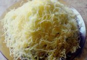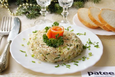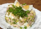 Этот вкусный, слоёный салат пополнит перечень блюд с печенью трески - продуктом чрезвычайно полезным, который заслуженно считается деликатесом.