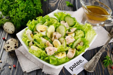 Вкусный салат из печени трески с пикантным соусом, который можно приготовить на любой праздник. Листья салата и огурцы добавят много свежести, а интересная заправка с лимонным соком придаст салату неповторимый вкус.