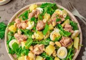 Вкусный, нежный, сытный слоеный салат с картофелем и печенью трески. Салат делается слоями (отварной картофель, зеленый лук, печень трески, картофель, печень трески, картофель, морковь) слои смазываются майонезом.