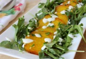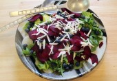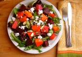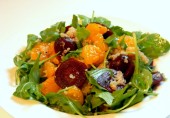 Салат из киноа с нутом на листьях рукколы, с красной свеклой и консервированными мандаринами, заправленный соусом из оливкового масла с винным уксусом и дижонской горчицей.