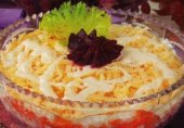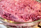 Чтобы салат Селедка под шубой выглядел празднично, предлагаю вам идею оформления в виде торта. Он готовится по классическому рецепту, все ингредиенты выкладываются слоями.