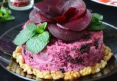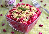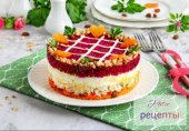 Вкусный и простой по составу ингредиентов салат с солёной сельдью, твёрдым сырой и свеклой выглядит особенно эффектно благодаря своей слоёной подаче.