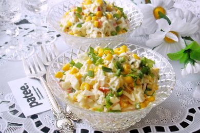 Легкий, сытный и очень вкусный салат из мяса кальмара, ветчины, консервированной кукурузы, отварных яиц и лука.