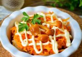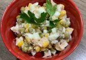 Салат с кукурузой благодаря этому злаку обладает оригинальным вкусом, а также является довольно сытным.