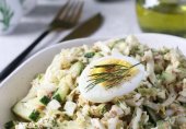 Легкий, свежий диетический салат, в котором превосходно сочетаются овощи, рыба и творожный сыр.