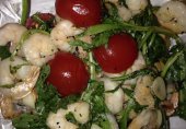 Креветки обжарить в горячем масле с чесноком и щепотку соли, отдельно обжарить шпинат секунды 3-4 и добавить помидоры Черри предварительно поделенные на две части и салат готов