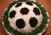 Украсив салат в виде футбольного мячика, можно порадовать своих мужчин.
