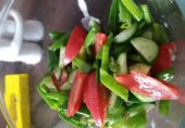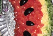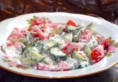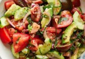 Салат из огурцов, репчатого лука, помидор и красного или зеленого стручкового перца.