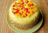 Отправляем его на пару часов в холодильник, перед подачей извлекаем из формы, снимаем пищевую пленку и украшаем ярким перцем и панировочными сухарями