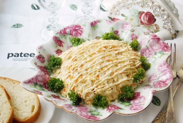 Очень нежный, сытный и вкусный салат из самых обычных продуктов. Готовится просто и быстро. Подойдет в праздники и в будни, в общем универсальное блюдо. Майонез можно заменить сметаной с горчицей.