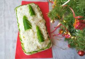 Каждый слой салата смазываем майонезом. - Украшаем салат: я сделала елочки из огурцов и выложила полукольца огурцов по периметру салата.