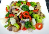 На сухой сковородке выпарить из грибов влагу, добавить сливочное масло и вложить приваренное брокколи и перец.