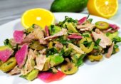 Салат с тунцом, оливками, редисом и авокадо