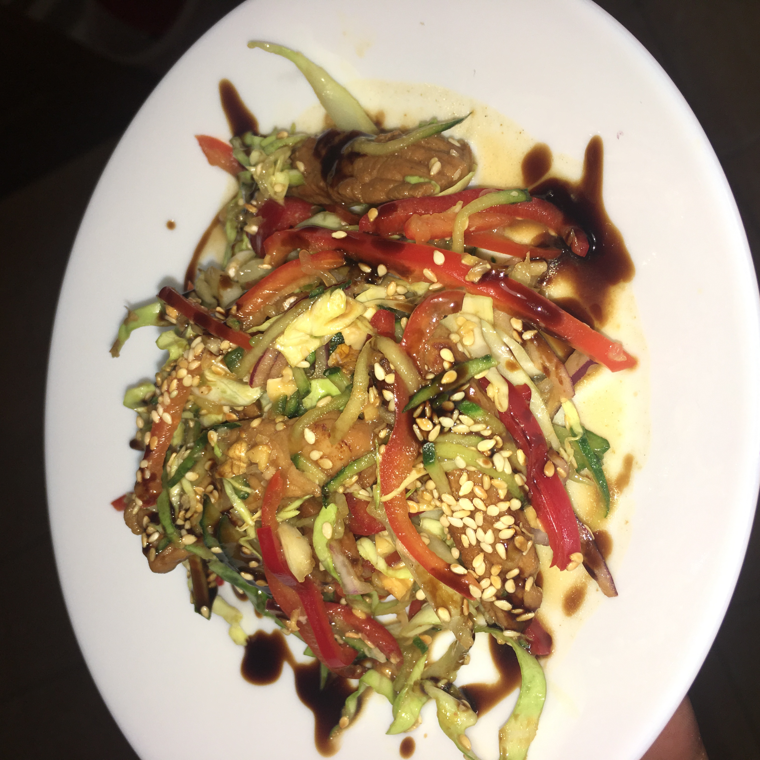 Чтобы приготовить заправку для салата, смешайте рыбный соус, сладкий соус чили, сок лайма и арахисовое масло. Полейте овощи приготовленным соусом.