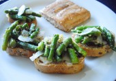 Бутреброды из хлеба, слегка подрумяненного в духовке с моцареллой, и обжаренной в масле спаржи с чесноком.