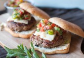 Сэндвичи с бургерами из фарша индейки со специями, сыром и салатом из помидоров с чесноком и базиликом.