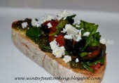 Бутерброды из итальянского хлеба чиабатта (или обычного белого) с песто, шпинатом, оливками и консервированными помидорами, посыпанные крошеным сыром фета.