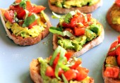 Бутерброды из французского хлеба с пюре из авокадо с соком лайма и помидорами с бальзамическим уксусом, чесноком и оливковым маслом, посыпанные свежим базиликом.