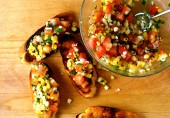 Бутерброды с кукурузой, приготовленной на сковороде-гриль, помидорами, маринованным луком, чесноком и базиликом.