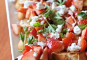 Легкая, вкусная и полезная закуска - тосты с клубникой и помидорами в бальзамическом уксусе и оливковом масле, посыпанные свежей петрушкой и козьим сыром.