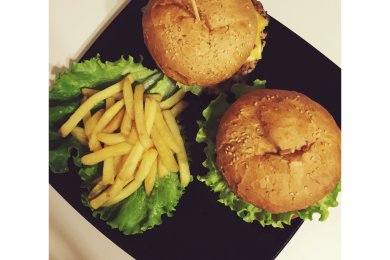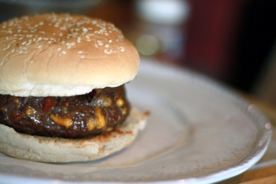 Бургер с черной фасолью, овсяными хлопьями и беконом, приправленный вустерским соусом. Подавать в булочке для бургеров с кетчупом, майонезом и рукколой.
