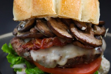 Бутерброды из говяжьих бургеров, приготовленных на гриле, жареных грибов и швейцарского сыра. Добавьте в бутерброд бекон, овощи и другие ингредиенты по вкусу.