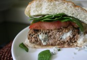 Бургеры с соусом барбекю и голубым сыром. Можно добавить листья шпината, помидор, грибы и карамелизованный лук.