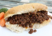 Бутерброды с говяжьим фаршем и луком, обжаренными на растительном масле и тушенными в кетчупе с соевым, острым и вустерским соусами и специями.