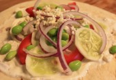 Пшеничная лепешка, смазанная йогуртовым соусом, с болгарским перцем, луком, огурцом и эдамаме.
