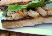 Бутерброды с креветками, жаренными на гриле, латуком, помидорами, луком и смесью майонеза с каджунской приправой и кайенским перцем.